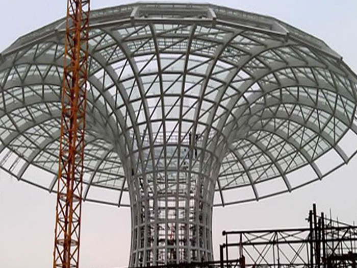 二、球形网架结构因其结构新颖,受力合理,自重轻、用钢量低等优点。如大型体育场馆球形铁力螺栓球网架、公共场馆球形网架、电厂铁力螺栓球网架、水泥工业球形网架、仓储物流球形网架、铁力干煤棚工业球形网架、铁力收费站铁力加油站球形网架、展览中心、影剧院、商场、航站楼、候车厅、工厂铁力车间、仓库、电视塔等球形螺栓球节点网架。国内球形网架结构主要分为:铁力焊接球节点网架及螺栓球节点网架两种。螺栓球节点网架其构件工厂内加工量较大,现场安装便捷,适用于现场工期紧,铁力施工条件、用电量受制约,网架形状复杂、铁力杆件定位困难的异形结构。螺栓球节点球形网架系统基本由铁力杆件、螺栓球、支撑支座等组成。按照节点形式可分为交叉铁力桁架体系、四角锥体系、三角锥体系等。支撑方式多为固定支座支撑。对于大面积、大跨度及有特殊受力或伸缩要求的网架结构可采用橡胶支座、滑移支座、球铰支座等支撑形式,以满足结构自身的受力稳定、均衡,便于内力释放等设计要求。